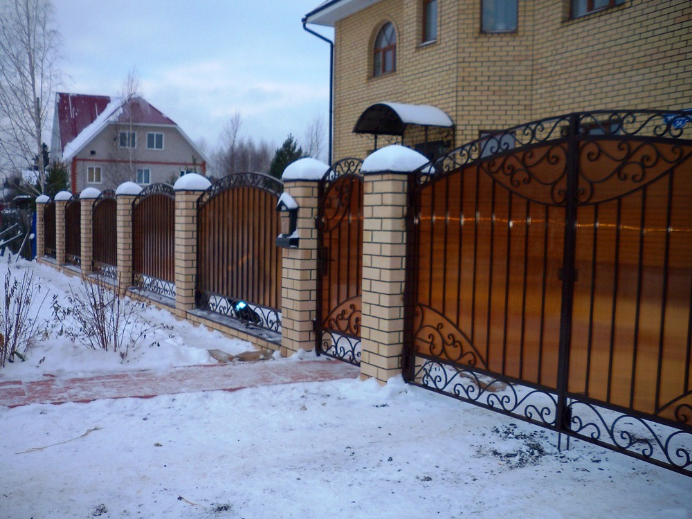 Указанные материалы помогают создавать уникальные современные ограждения с привлекательным внешним видом. Металл покрывается сверху слоем полимерной краски, можно выбрать абсолютно любой оттенок, чтобы добиться максимального сочетания с внешним видом дома.